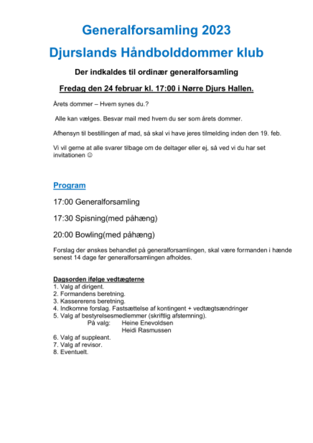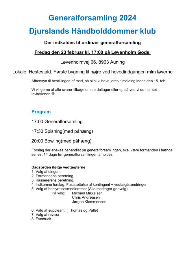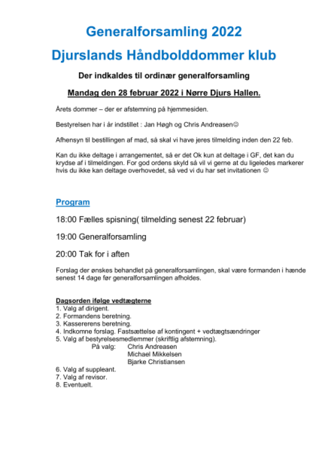 Der indkaldes inden længe til generalforsamling. Vi forventer det bliver ultimo februar.